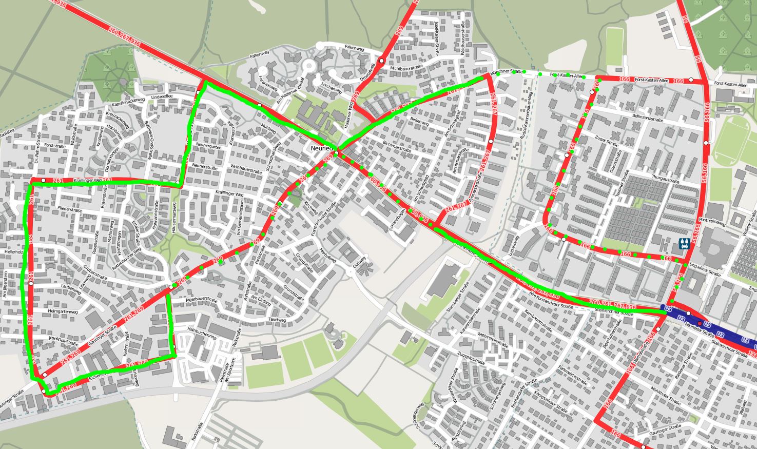 Frau Bladt regte deswegen an, die Direktverbindung nach Neuried zum dort geschaffenen Einkaufszentrum wieder einzurichten. Nicht nur könnte man die Vielfalt der Geschäfte dort nutzen, auch die Physiotherapeuten und eine benutzbare(!) Post lägen quasi auf dem Weg. Vielleicht sei es auch eine Option, wenn der 261 eine Schleife führe, anstatt retour durch Neuried zu kurven. Im Schweizer Viertel könnte er dann gegenläufig zum 166er fahren, und man müßte die bestehende Route nur geringfügig ändern. Siehe gepunktete Linie im Bild oben.