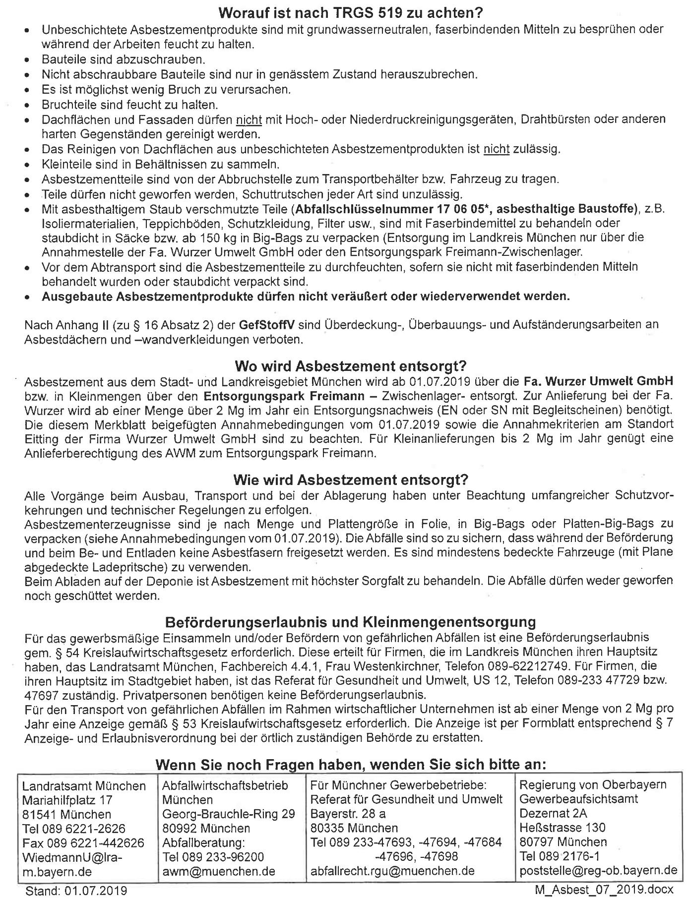 Gerade das Merkblatt des Landratsamts München zum Thema und Umgang mit Asbest erschien uns passend, an dieser Stelle veröffentlicht zu werden, hier einmal die ersten beiden Seiten: